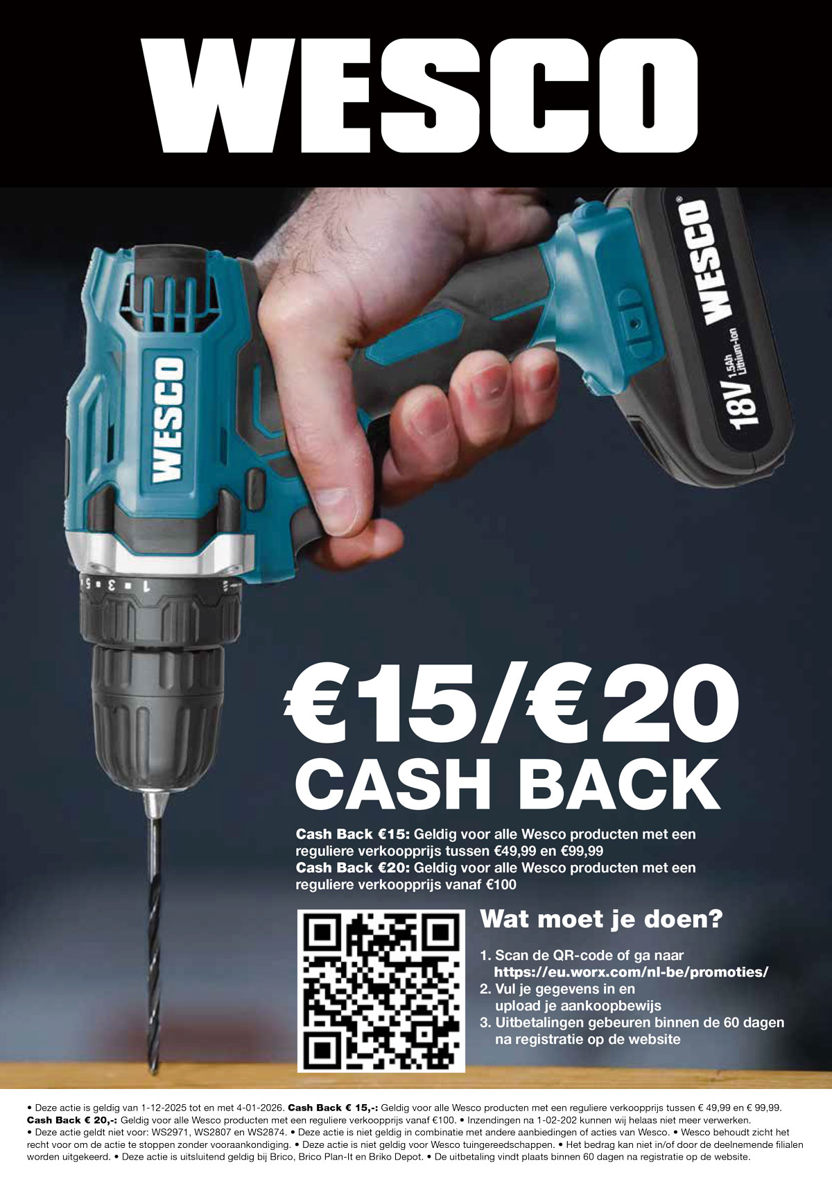 - Cash Back € 15,-: Geldig voor alle Wesco producten met een reguliere verkoopprijs tussen € 49,99 en € 99,99.