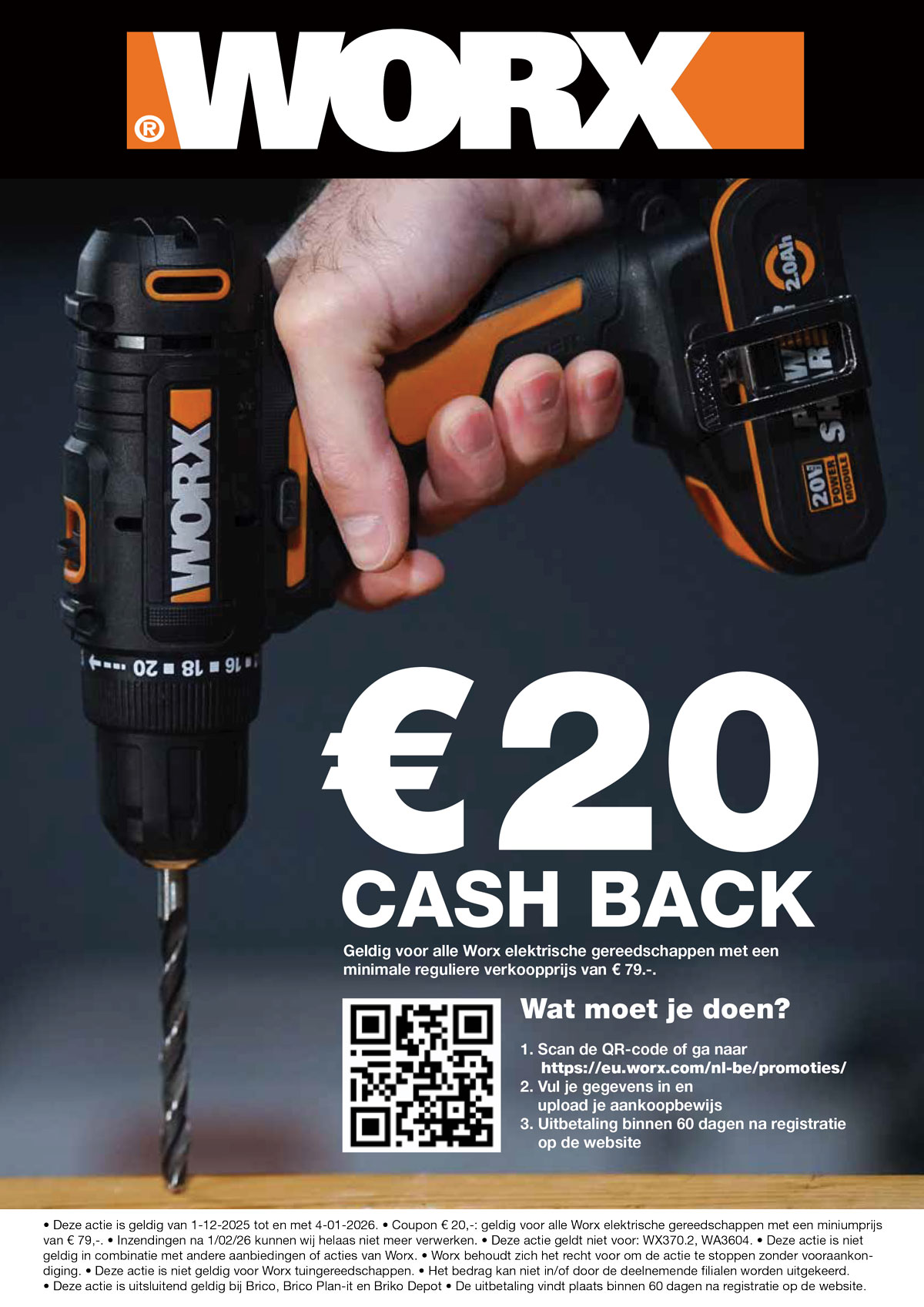 - Coupon € 20,-: geldig voor alle Worx elektrische gereedschappen met een miniumprijs van € 79,-.
